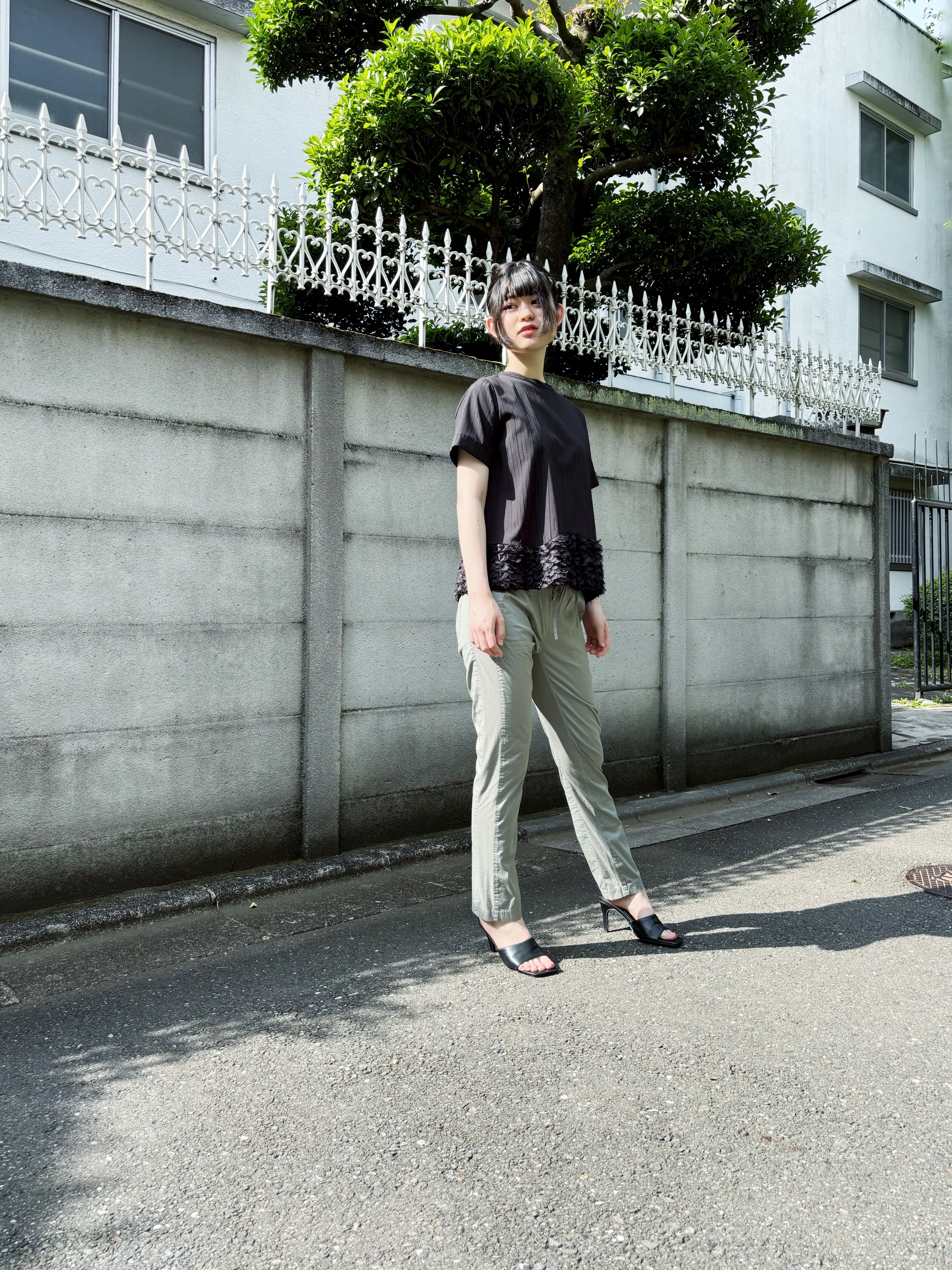 こちらの夏バージョンは、ウエストに紐のアクセントがあるので、カットソーをインして着るのもあり