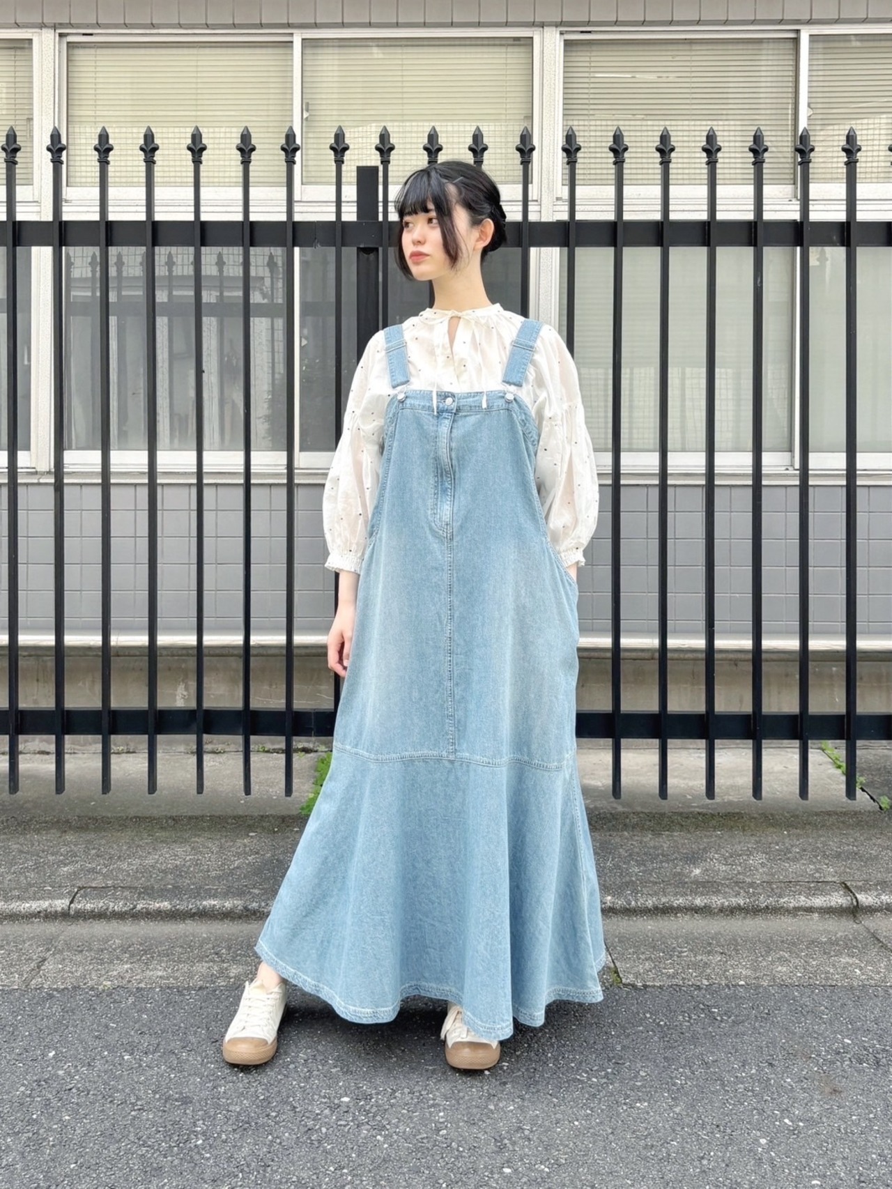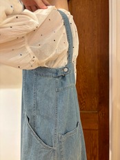 カジュアルになりがちなデニムサロペットも、マーメイドシルエットのスカートで、ちょっと人とは違った雰囲気に