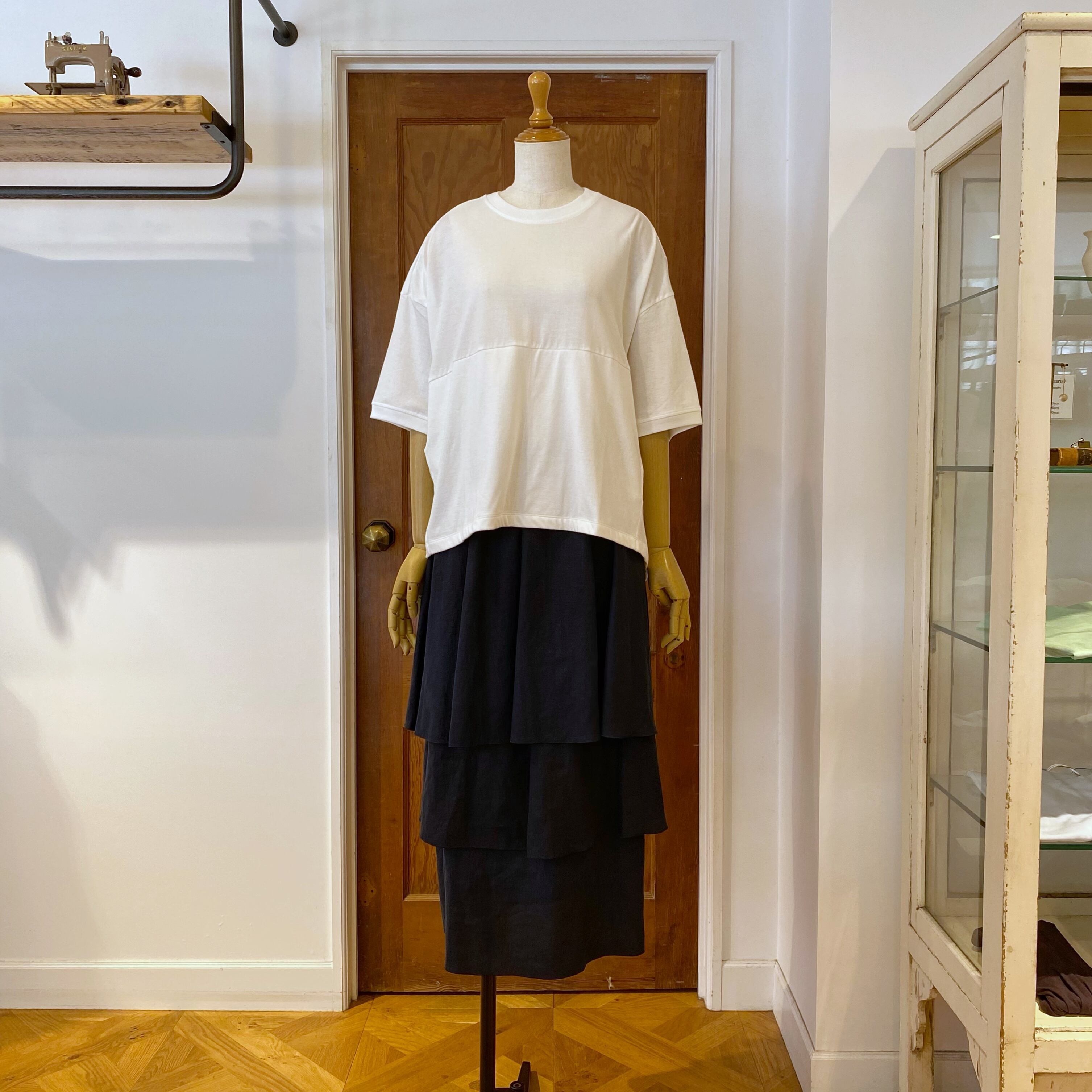 1段目のフリルを長めにとることで、ボリュームが抑えられ、大人の女性も着やすいシルエットに。