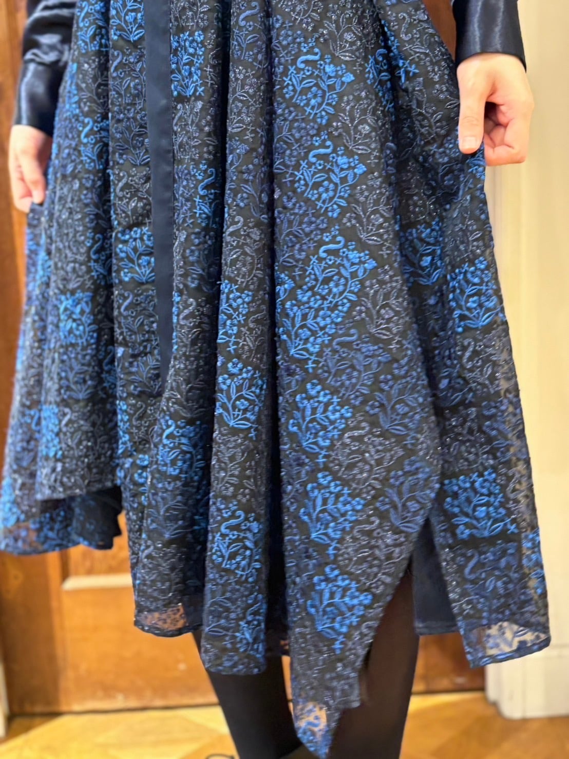 オリジナルの刺繍パネルと滑らかな肌触りと光沢を放つアセテート地が高級感を感じさせる一着。