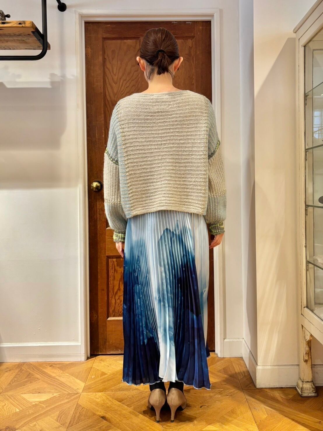 ベースのグレージュの色がふんわり優しいトーンなので、様々なお色のボトムとコーデしやすい。